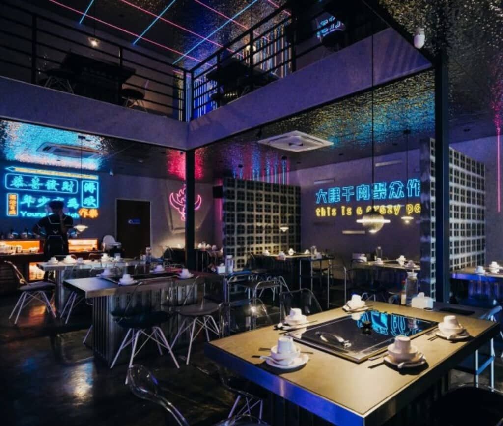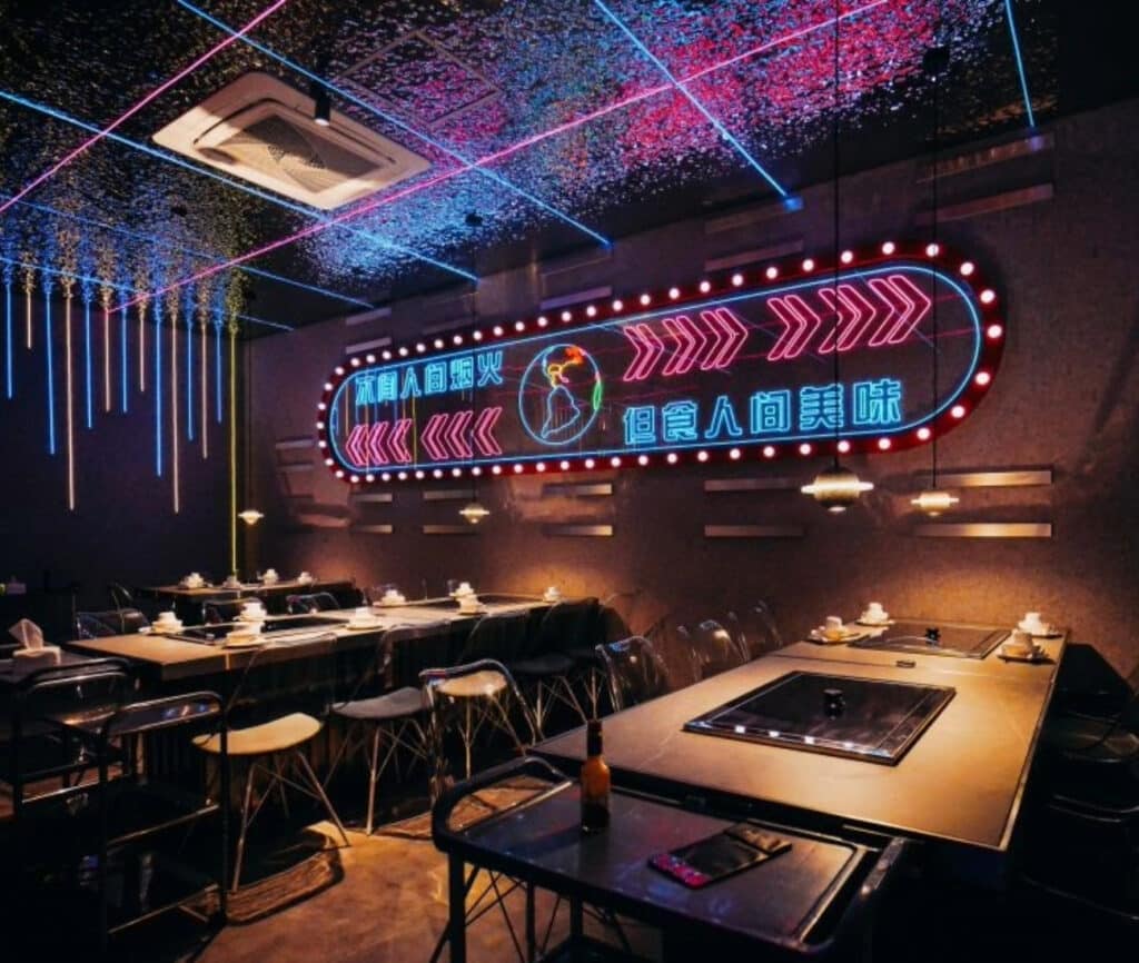 The moment you step into Niubility BBQ Bistro, you’re greeted by an interior that mirrors a sci-fi fantasy. The futuristic theme is meticulously crafted, featuring elements like a 3D moon, neon lights, and a mini stage, all contributing to an immersive space station experience. The large screens displaying cosmic visuals further enhance the ambiance, making every visit a memorable escape from the ordinary.